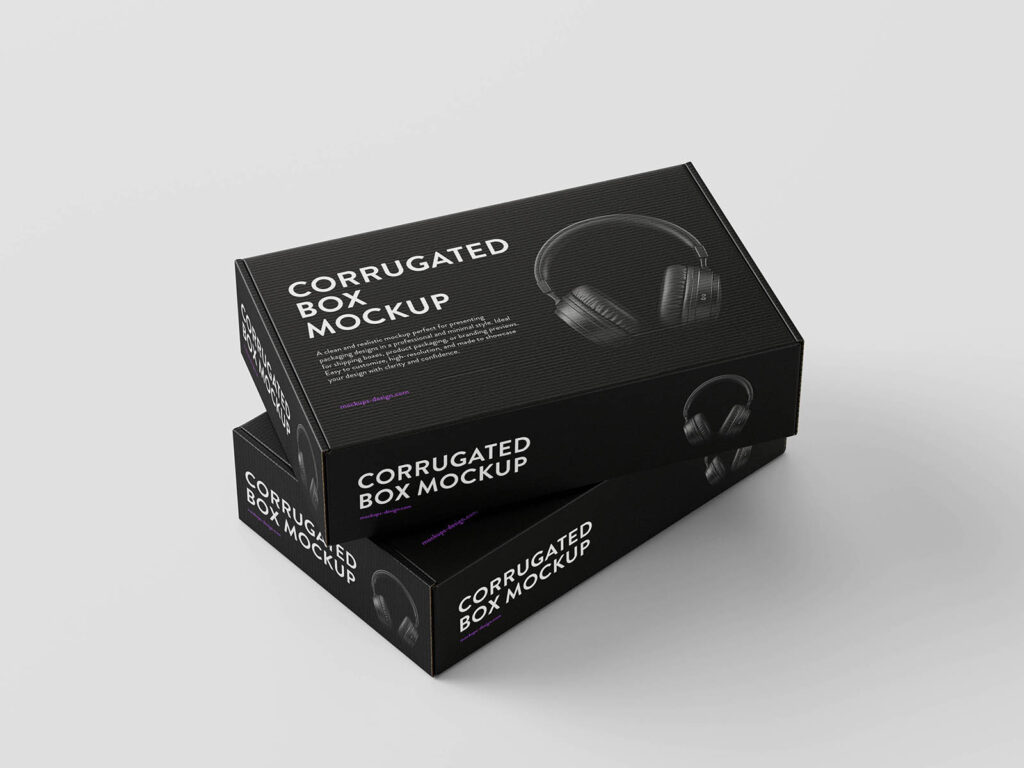 Com visual sofisticado e acabamento fosco, o Mockup de Caixa de Papel Grátis apresenta um design elegante e profissional que valoriza produtos e identidades visuais com um toque premium. O estilo minimalista das caixas de papelão ondulado cria uma apresentação moderna e realista, ideal para destacar marcas em contextos comerciais e criativos.