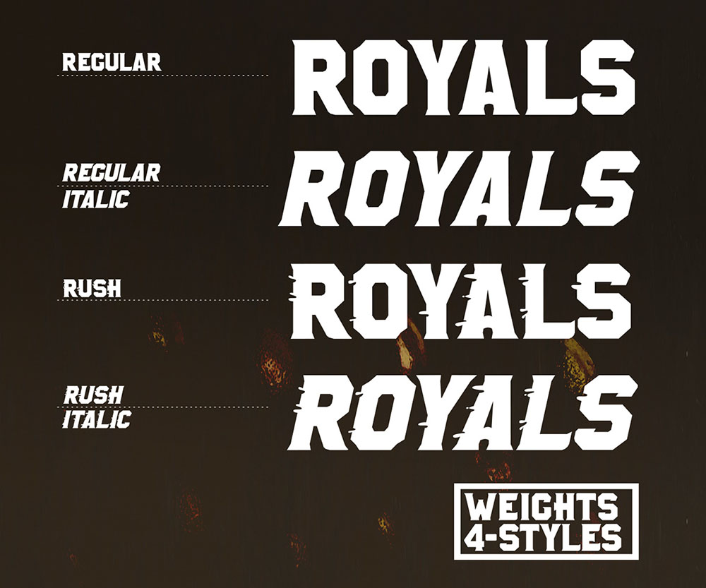 Com estilo clássico e presença marcante, a ROYALS é uma fonte em negrito que combina elegância e modernidade em perfeita harmonia. Suas bordas limpas reforçam um visual sólido e sofisticado, ideal para títulos e cabeçalhos que precisam de impacto visual.